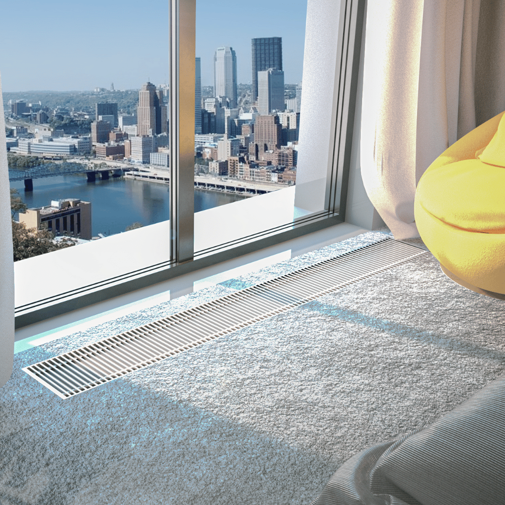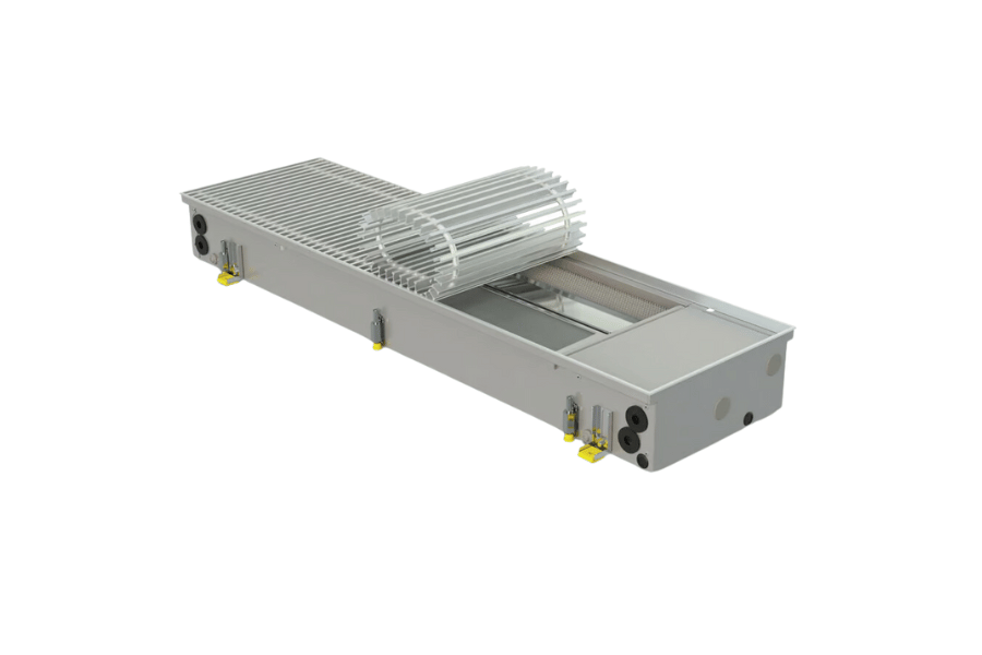 Įleidžiamas grindinis fankoilas su ventiliatoriumi šildymui ir vėsinimui
